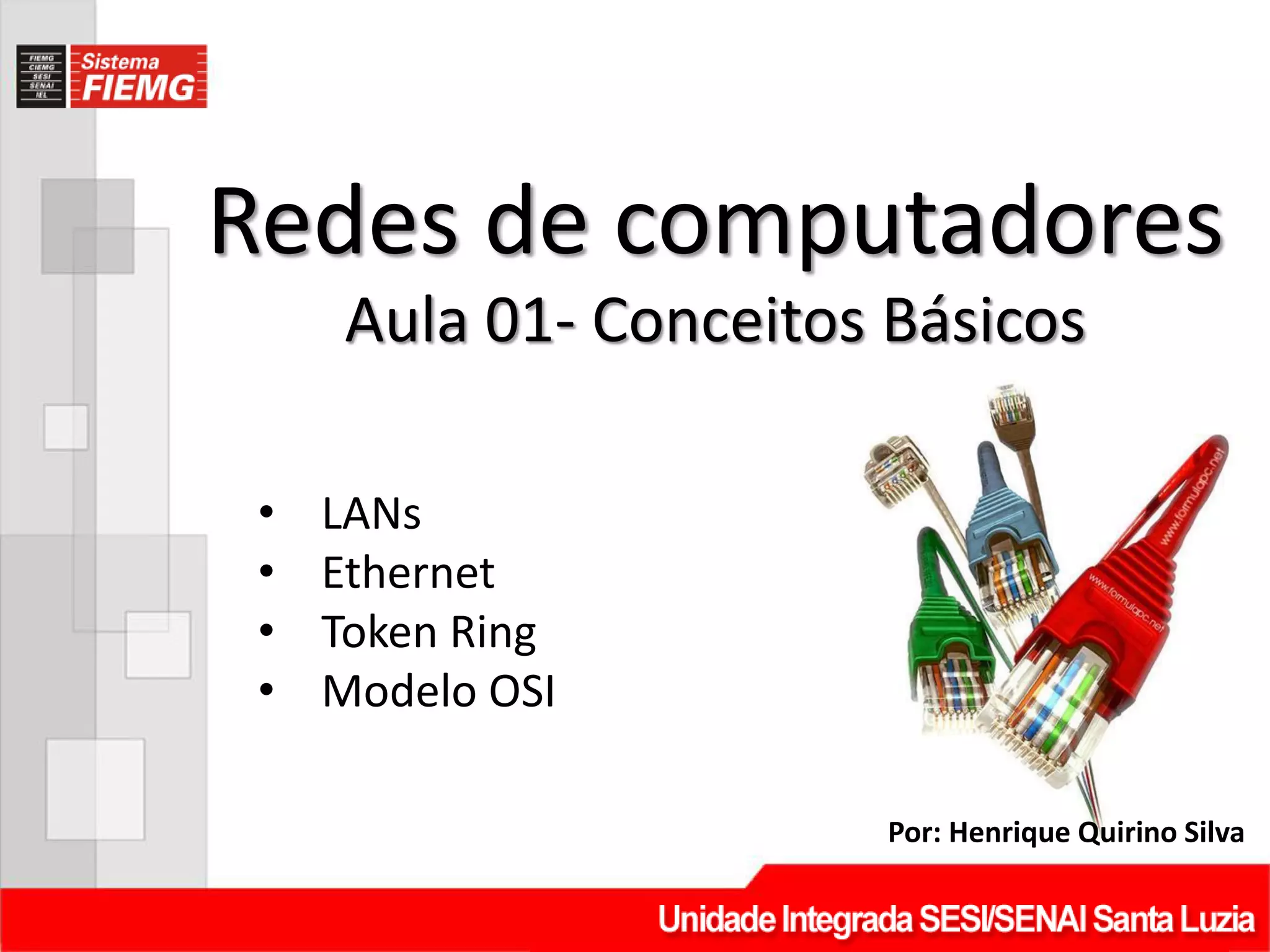 O documento resume os principais conceitos de redes de computadores, incluindo definição de redes, endereçamento, protocolos, serviços de rede, meios de transmissão, modelos OSI e Ethernet.