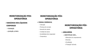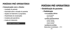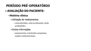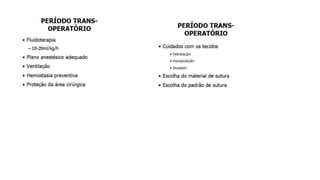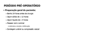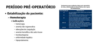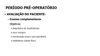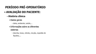 2) Os principais fatores considerados na avaliação pré-operatória incluem idade, sexo, raça, comportamento e exames laboratoriais.