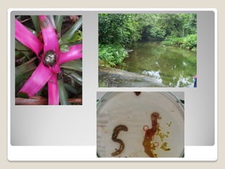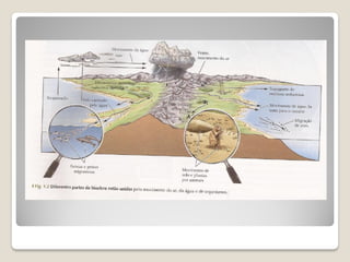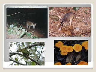 O documento define ecologia e descreve seus níveis de organização, incluindo organismos, populações, comunidades e ecossistemas. Também discute as propriedades emergentes em cada nível e como fluxos de matéria e energia conectam os sistemas ecológicos. Finalmente, resume os principais métodos e objetivos da investigação científica na ecologia.