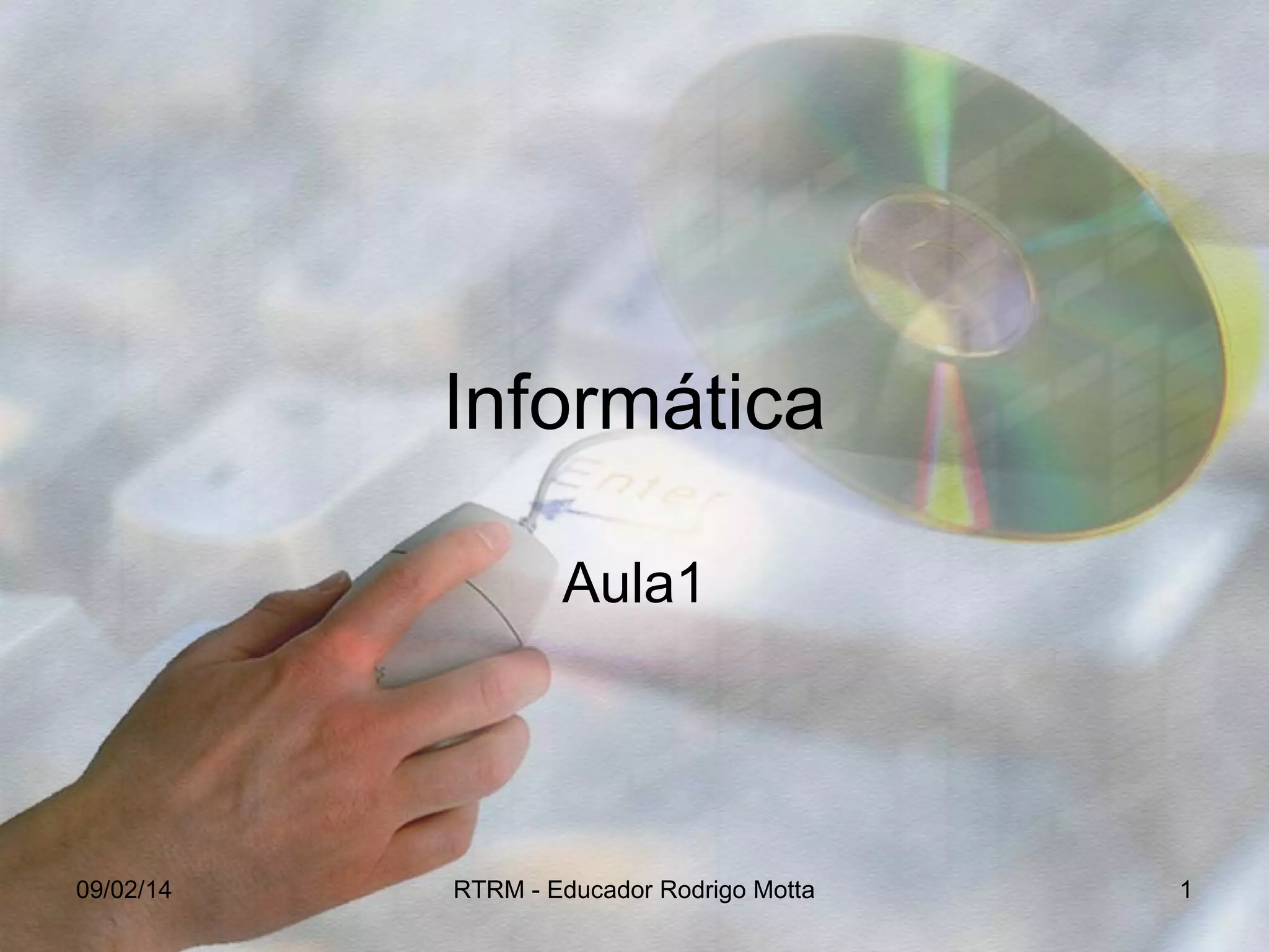 O documento apresenta uma aula introdutória sobre informática, abordando tópicos como o que é informática, sua aplicação no dia a dia, tipos de computadores, conceitos básicos de hardware e software e uma breve história dos sistemas operacionais Windows, Mac OS, Linux, KDE e Gnome.