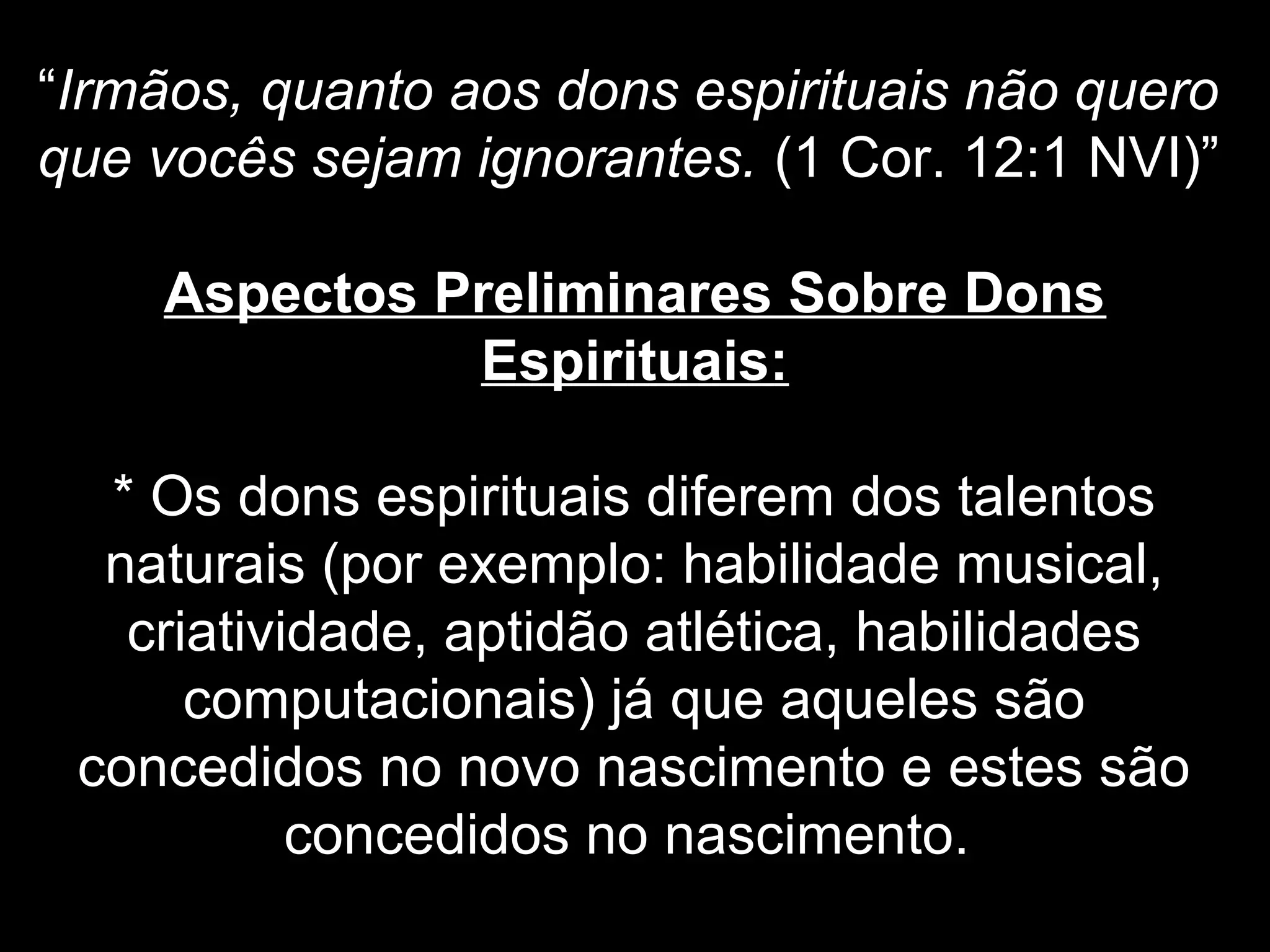 O documento discute os dons espirituais concedidos por Deus para edificar a Igreja. Apresenta três dons específicos: sabedoria, conhecimento e fé. A sabedoria é a habilidade de aplicar princípios bíblicos às situações da vida. O conhecimento é a capacidade de estudar e reter informações. A fé é confiar em Deus para realizar o impossível.