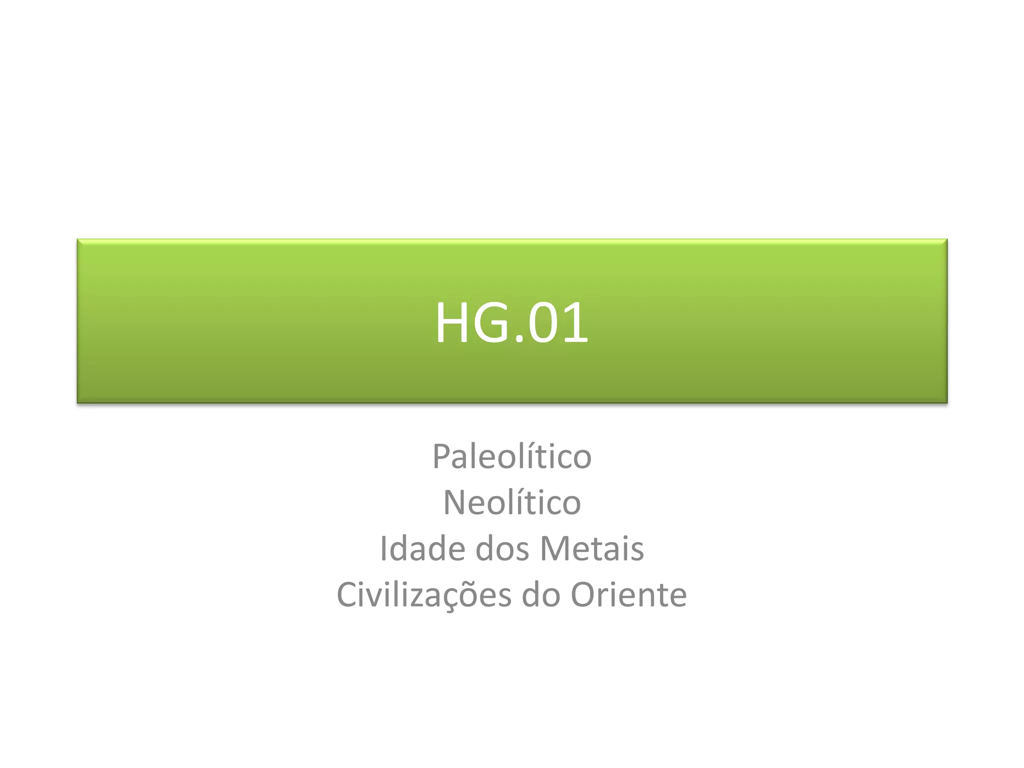 O documento descreve as principais eras da pré-história e algumas civilizações antigas, incluindo o Paleolítico, Neolítico e Idade dos Metais. Também discute as civilizações do Egito Antigo e da Mesopotâmia, notando que ambas se desenvolveram ao longo de rios e eram sociedades estratificadas baseadas na agricultura.