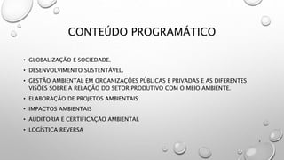 Este documento apresenta o conteúdo programático de uma disciplina de Gestão Ambiental ministrada pela professora Andrea Alves. Os tópicos abordados incluem globalização e sociedade, desenvolvimento sustentável, gestão ambiental em organizações, elaboração de projetos ambientais, impactos ambientais, auditoria e certificação ambiental e logística reversa. As avaliações e seminário também são descritos.