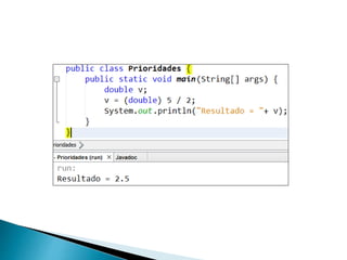 O documento apresenta uma introdução sobre a linguagem Java, definindo-a como uma linguagem de programação de alto nível, interpretada e orientada a objetos. Também apresenta alguns comandos básicos do NetBeans IDE e conceitos fundamentais como variáveis, tipos de dados, declaração, atribuição e operadores matemáticos.