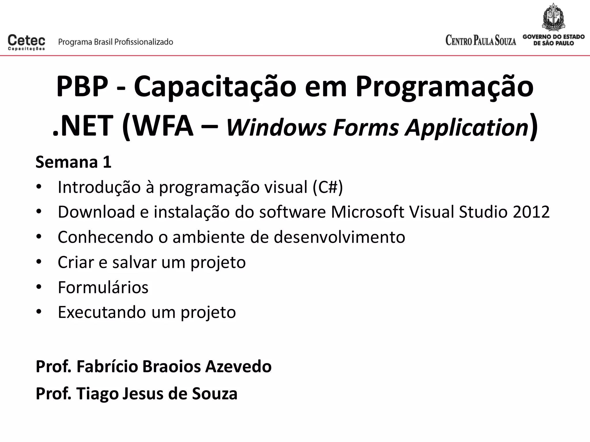O documento apresenta uma introdução ao desenvolvimento de aplicativos Windows com .NET usando Visual Studio. As principais informações apresentadas são: