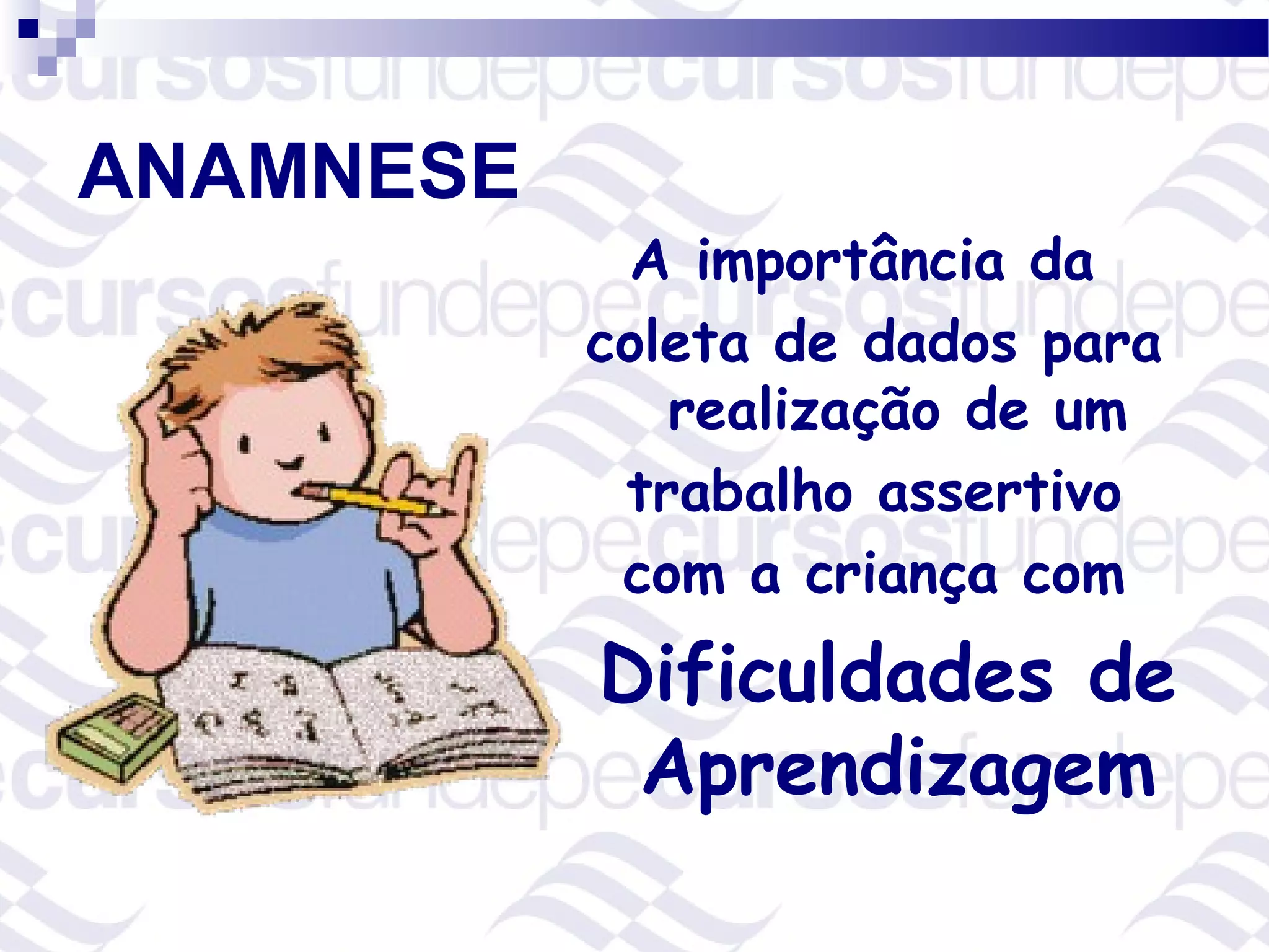 O documento discute a importância da anamnese na realização de um trabalho assertivo com crianças que têm dificuldades de aprendizagem. A anamnese é uma entrevista com o responsável pela criança para levantar informações desde o período pré-natal até a idade atual, com o objetivo de obter dados que possam ajudar na avaliação e no planejamento do tratamento. É essencial que o local da entrevista garanta privacidade e conforto para que o responsável se sinta à vontade