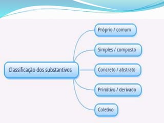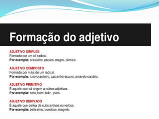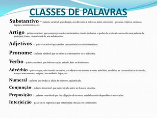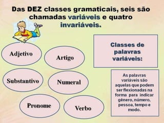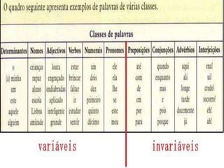 O documento apresenta as divisões da gramática, incluindo morfologia, sintaxe, fonologia, estilística, pontuação e semântica. Explica a estrutura das palavras, abordando elementos como radical, desinência, vogal temática, tema e afixos, além de descrever formas de formação de palavras como derivação e composição. Também apresenta as classes de palavras na língua portuguesa, categorizando-as em verbais ou nominais e variáveis ou invariáveis.