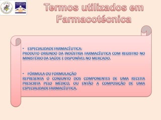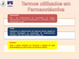 O documento descreve conceitos fundamentais da farmacotécnica, que estuda as operações e formas farmacêuticas. A farmacotécnica tem como objetivo transformar substâncias medicamentosas em formas farmacêuticas por meio de técnicas de manipulação, visando facilitar a administração e ação dos medicamentos.