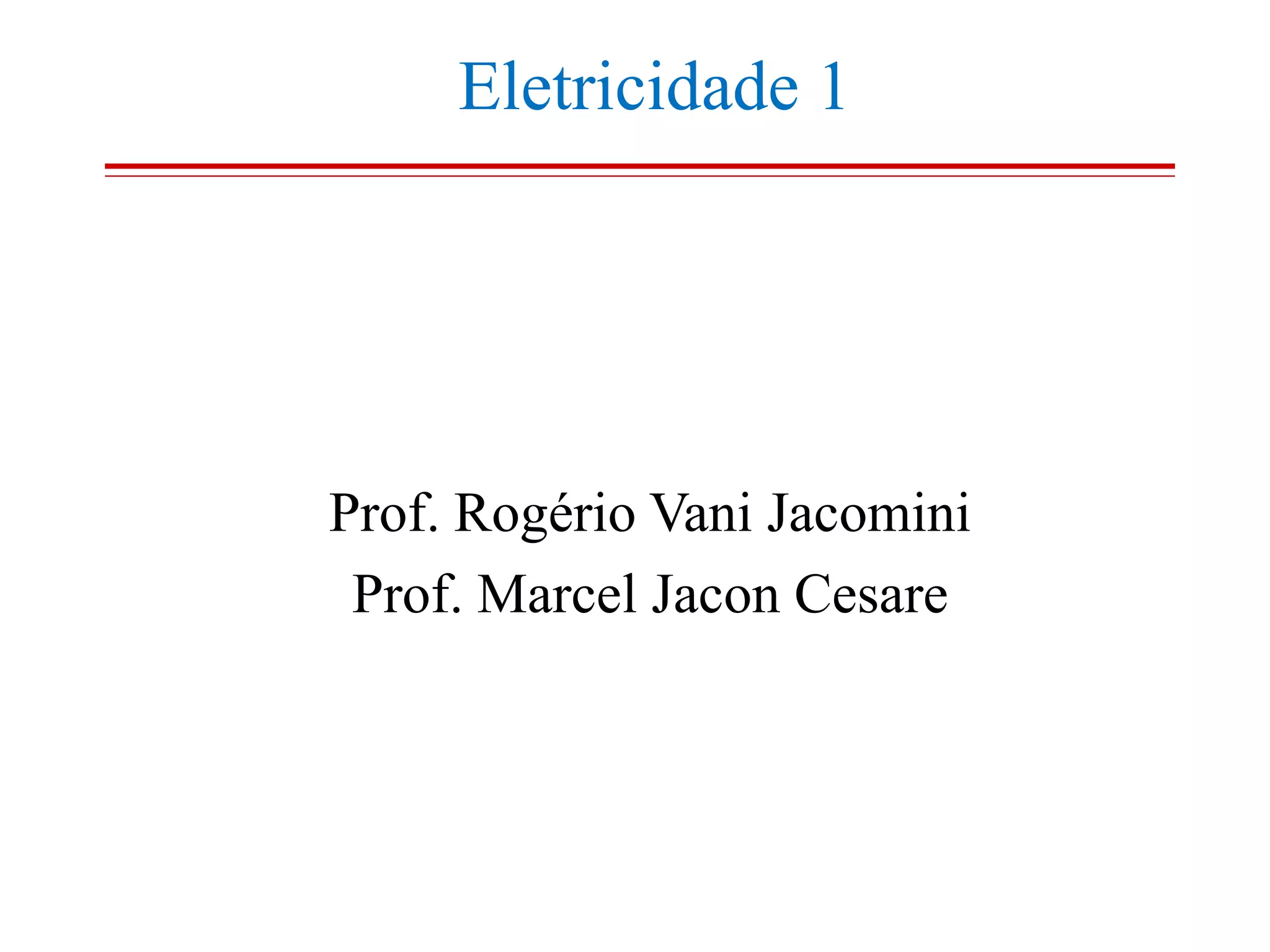 O documento descreve um plano de aula para o curso de Eletricidade 1. Ele inclui os professores responsáveis, o conteúdo programático e os critérios de avaliação. Os alunos serão avaliados por meio de provas e relatórios de laboratório, e a nota final será calculada pela média dessas avaliações.