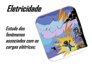 O documento discute os conceitos básicos de eletrostática. Especificamente, define eletrostática como o estudo do comportamento de cargas elétricas em repouso, incluindo processos de eletrização, campo elétrico, força eletrostática e potencial elétrico. Também descreve os modelos atômicos, incluindo o atual que leva em conta o princípio da incerteza, e a composição básica do átomo com prótons, nêutrons e elétrons.