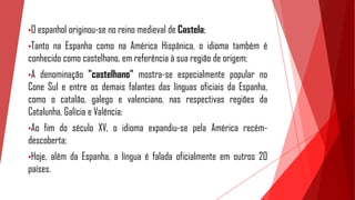O espanhol originou-se na Espanha medieval e se expandiu para a América após sua descoberta no século 15. Hoje, é falado oficialmente em 21 países e é a terceira língua mais falada no mundo, depois do mandarim e do inglês. O espanhol também exerce influência em países vizinhos como Portugal e Brasil, onde é estudado por muitos.