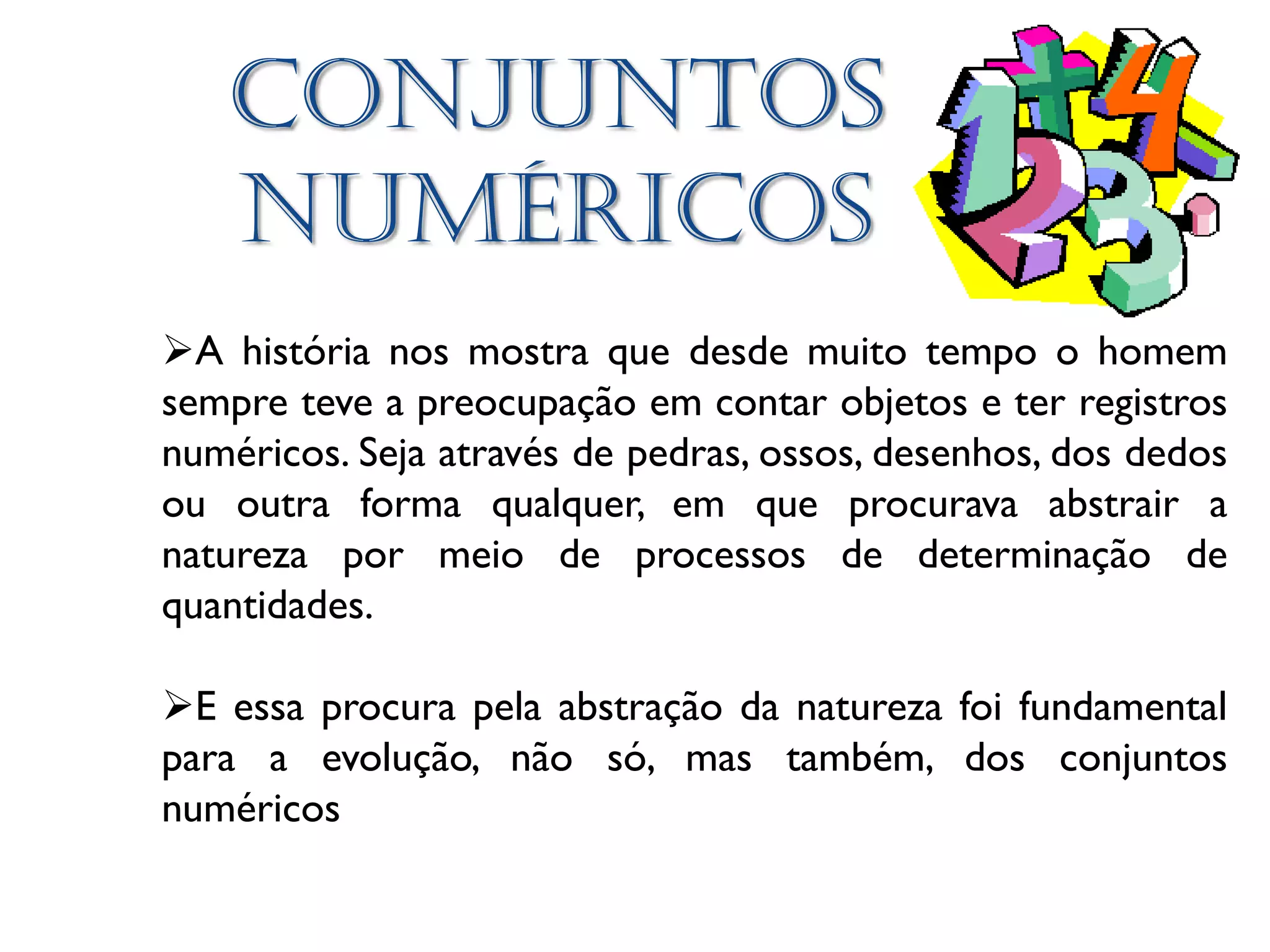 O documento descreve os principais conjuntos numéricos e suas propriedades, incluindo: