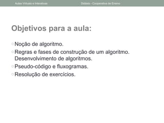 O documento discute algoritmos e suas representações. Ele define algoritmo, lista os passos para construir um algoritmo e apresenta formas de representá-los, incluindo descrição narrativa, fluxogramas e pseudocódigo. O documento também explica o que são fluxogramas, seus elementos e como podem ser usados para ilustrar processos de forma simples.