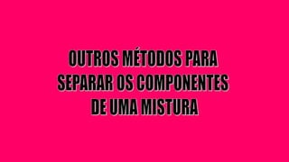 O documento discute vários métodos de separação de misturas, incluindo evaporação, cristalização, destilação, decantação, centrifugação, filtração, sublimação e flotação. Ele explica quando cada um desses processos deve ser usado dependendo do tipo de mistura a ser separada.