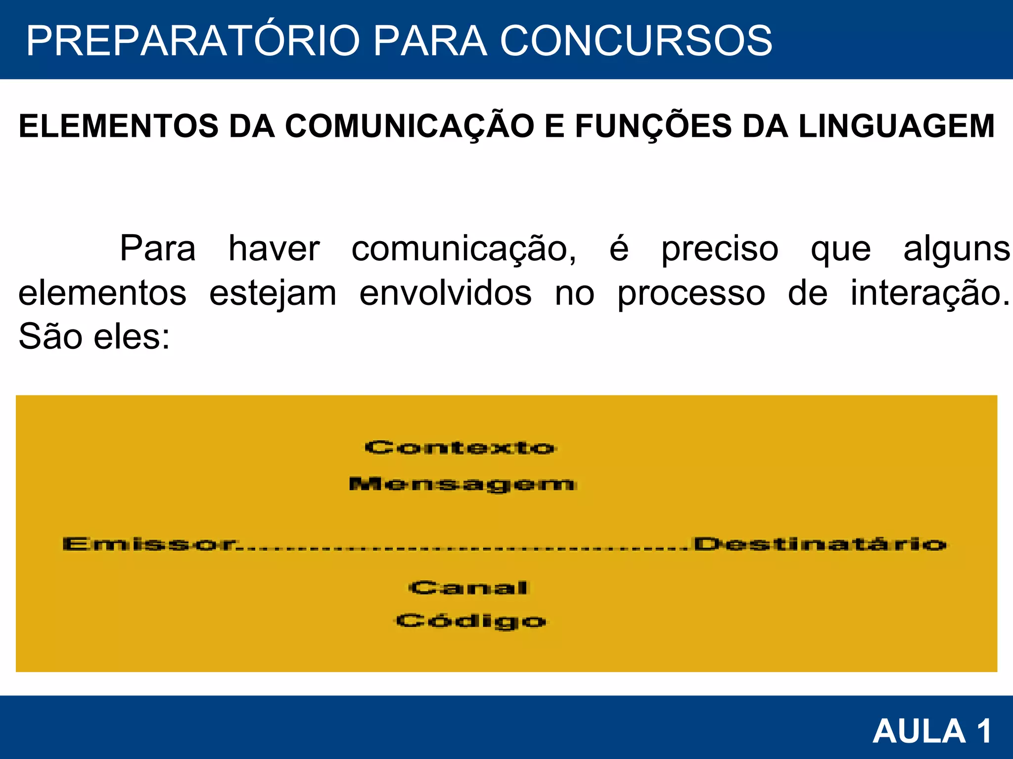 O documento discute os elementos da comunicação e as funções da linguagem. Apresenta os elementos necessários para a comunicação, como emissor, receptor, código, canal e mensagem. Também descreve as seis funções da linguagem: referencial, emotiva, conativa, fática, metalinguística e poética.