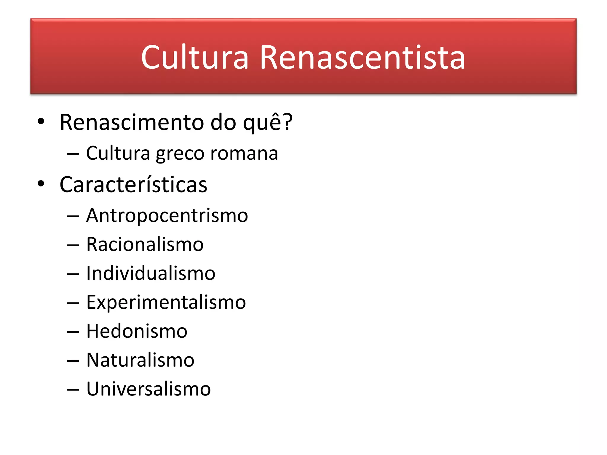 O Renascimento começou na Itália devido à sua proximidade com a Grécia e Roma antigas e sua ativa vida comercial e urbana, ressurgindo valores como o racionalismo, individualismo e naturalismo inspirados na cultura greco-romana. A arte renascentista combinou conhecimento científico e estética para superar os modelos clássicos, enquanto literatos como Dante, Petrarca e Boccaccio popularizaram as línguas nacionais. Cientistas como Copérnico, Bruno, Da Vinci e