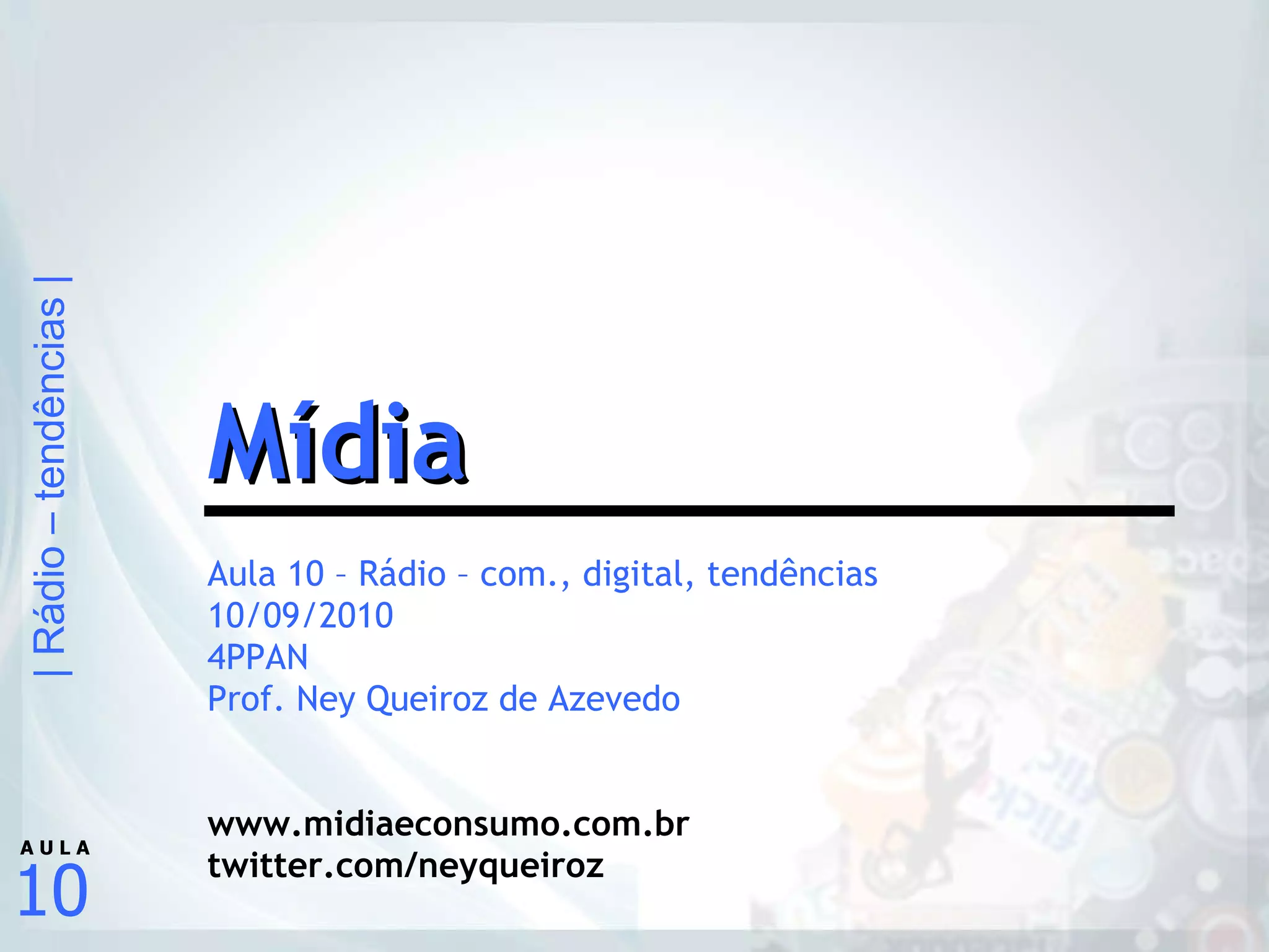 1) Informações sobre a disciplina de rádio ministrada pelo professor Ney Queiroz de Azevedo, incluindo carga horária, avaliação e materiais de apoio.