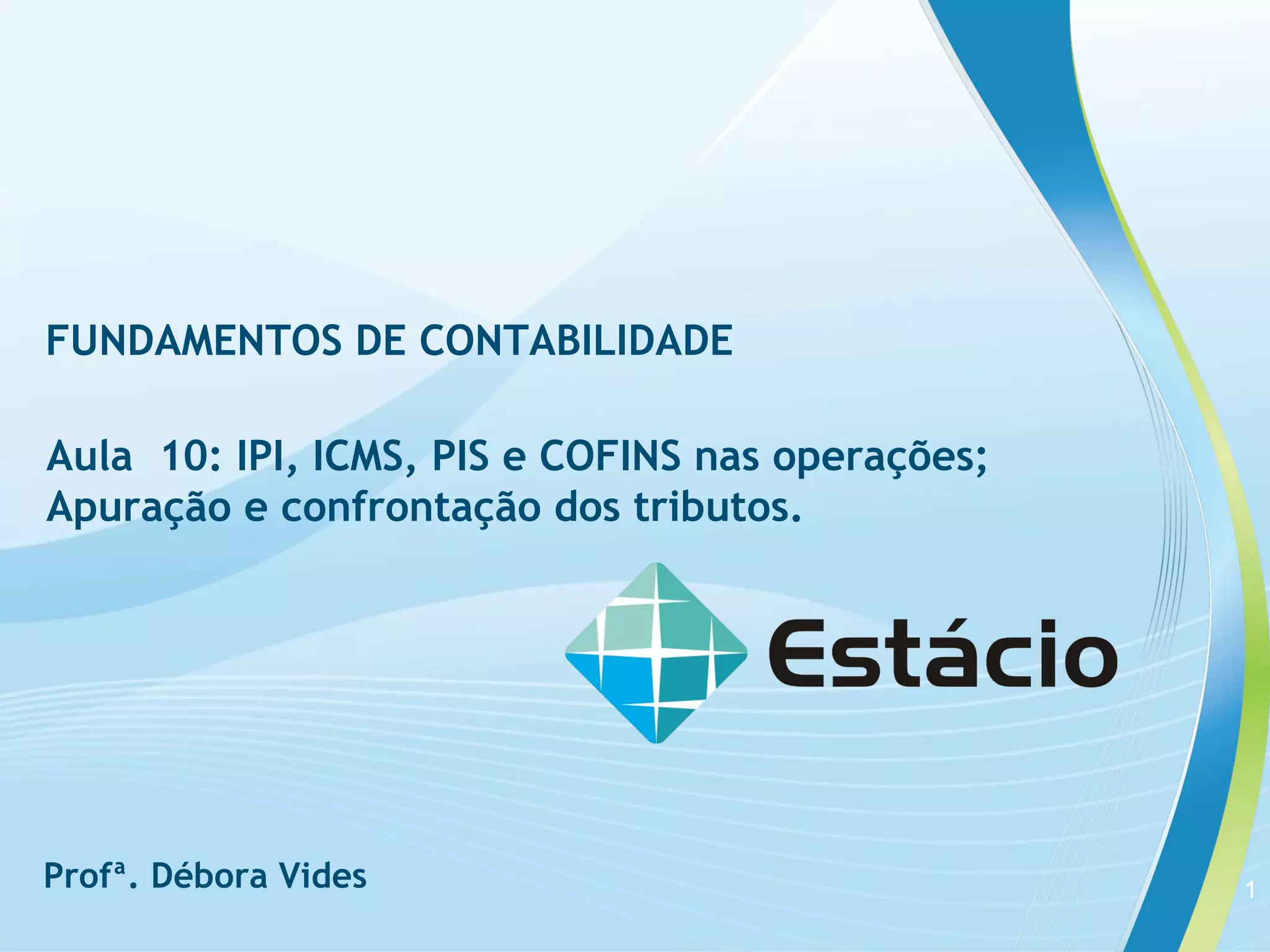 O documento discute os tributos IPI, ICMS, PIS e COFINS que incidem sobre operações de compra e venda, definindo cada um, seus contribuintes e características. Também aborda a apuração destes tributos, destacando os recuperáveis e não recuperáveis, e apresenta um exemplo numérico de compra de mercadorias.