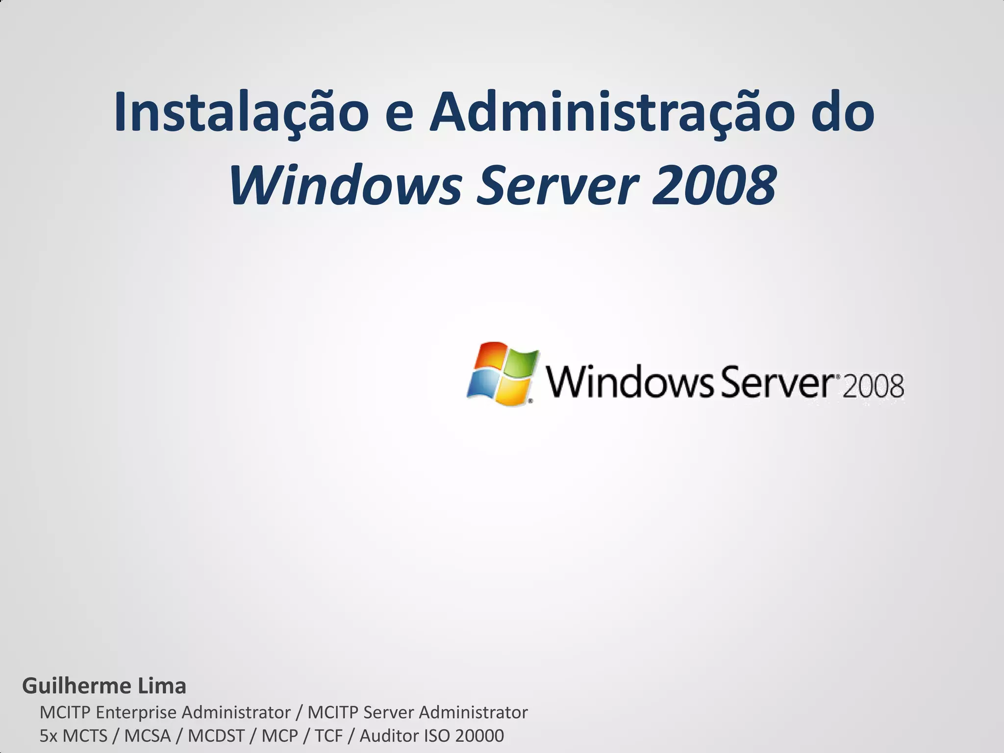 O documento discute a instalação e administração do Windows Server 2008. Ele apresenta um ambiente de TI existente com problemas como falta de controle de acesso e vazamento de informações. O documento sugere soluções como instalar servidores de domínio e arquivos para implementar controle de acesso, grupos e políticas de segurança.