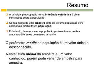 Este documento discute estimação estatística. Ele define estimador como qualquer função da amostra que estima um parâmetro populacional e destaca a importância de um estimador ser não viciado, consistente e eficiente. Exemplos ilustram como calcular a esperança e variância de estimadores para estimar a média e variância populacional.