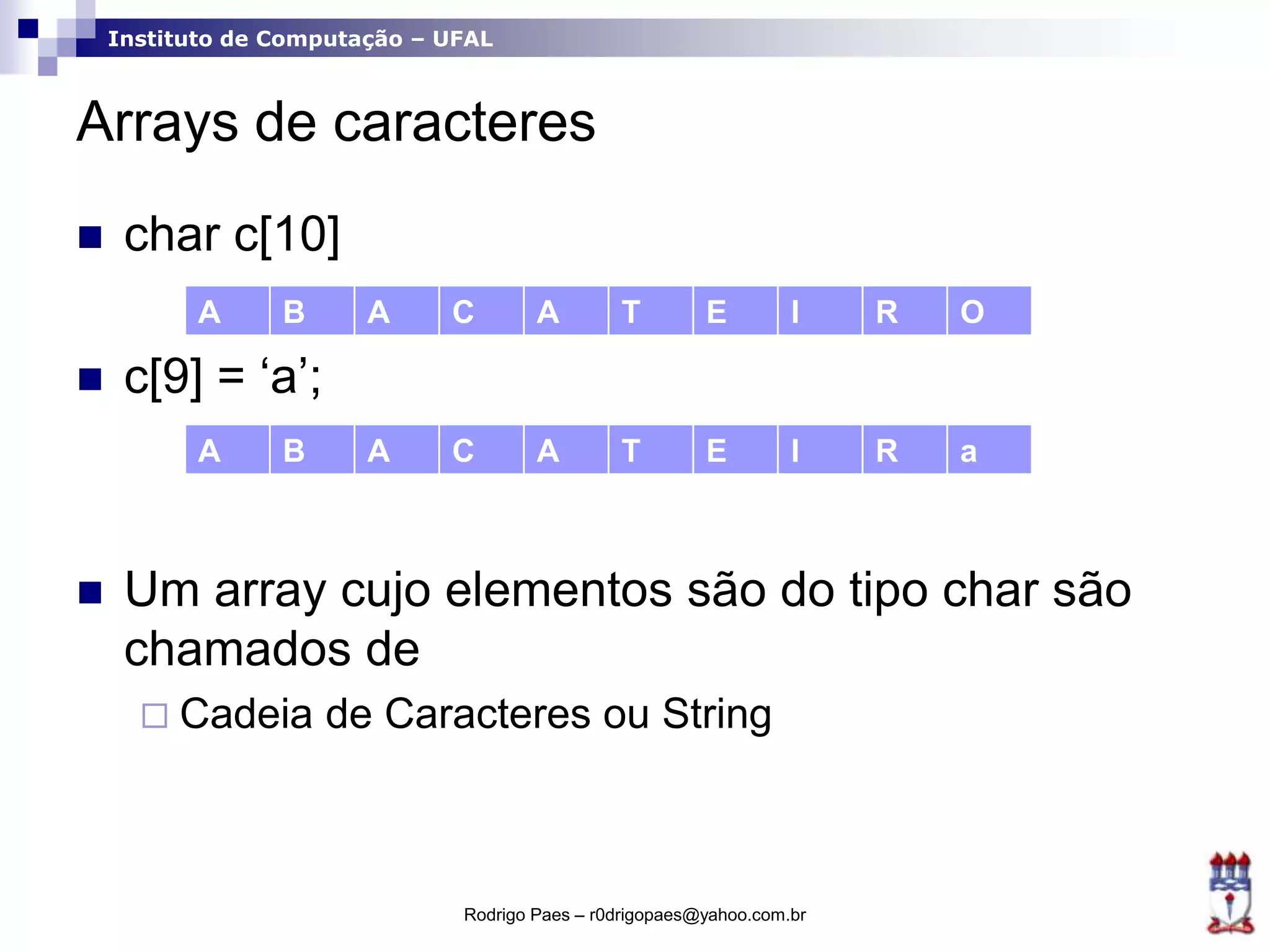 O documento discute strings em C, incluindo arrays de caracteres, inicialização e terminação de strings com \0, e funções para manipular strings como strcpy e strlen. Ele também fornece exercícios sobre strings para os alunos.