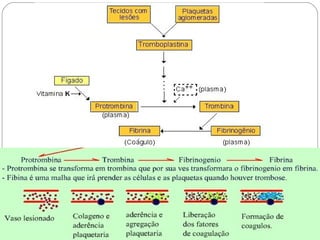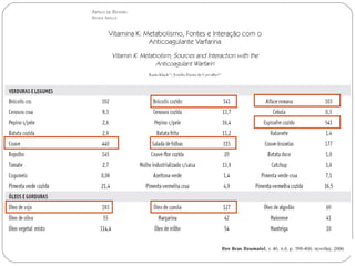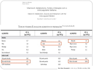 O documento discute as propriedades e funções da vitamina K. A vitamina K atua como cofator em reações que formam proteínas importantes para a coagulação sanguínea e formação óssea. As principais fontes alimentares são vegetais de folhas verdes e óleos vegetais. A deficiência pode causar problemas de coagulação, enquanto a toxicidade raramente ocorre com ingestão normal de alimentos ou suplementos.