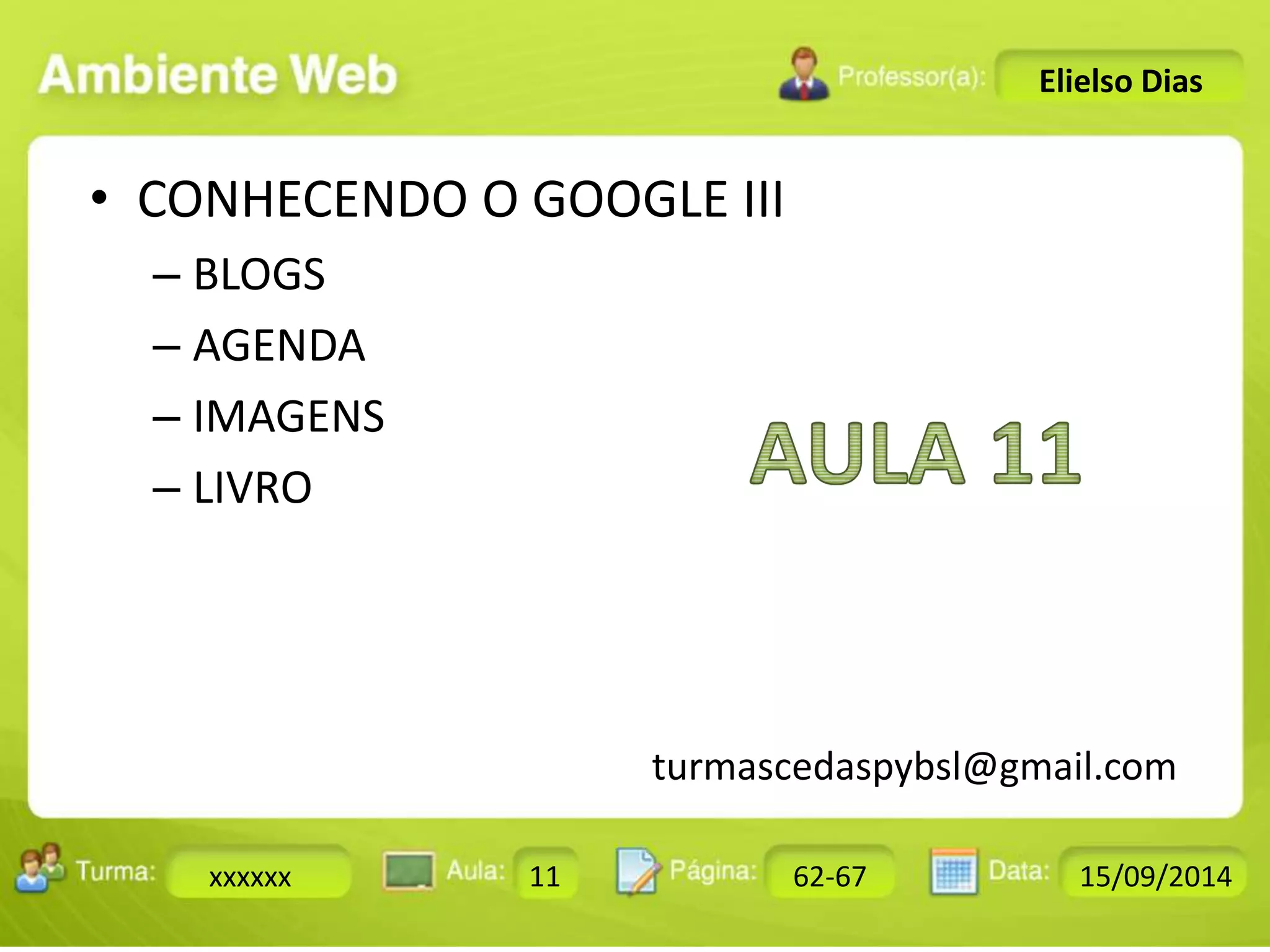 O documento discute o uso de blogs, agendas e imagens no Google. Explica o que são blogs, como são usados pessoalmente e corporativamente, e fornece exemplos de provedores de blogs. Também descreve a agenda do Google e como pesquisar imagens e livros no Google.