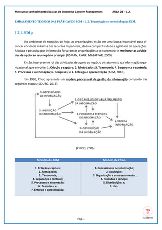 O documento discute os conceitos e tecnologias de Enterprise Content Management (ECM), incluindo gestão de documentos, registros eletrônicos e fluxos de trabalho. Também aborda as tecnologias de captura de imagem como reconhecimento óptico de caracteres, marcas e digitalização para converter documentos físicos em digitais.