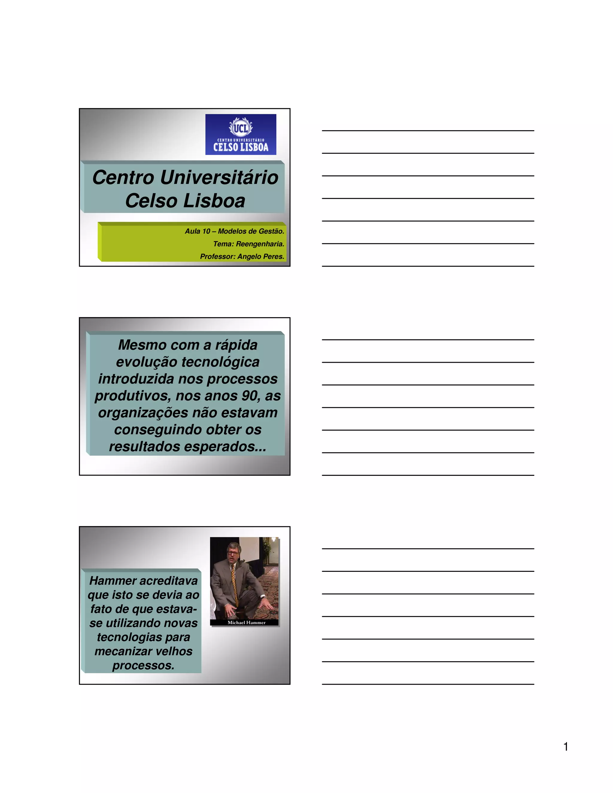 O documento discute o conceito de reengenharia introduzido por Hammer, que propõe redesenhar radicalmente os processos de trabalho para obter melhorias dramáticas nos resultados das empresas. A reengenharia envolve redesenhar completamente os processos em vez de apenas automatizar os existentes, com foco em qualidade, inovação e serviço.