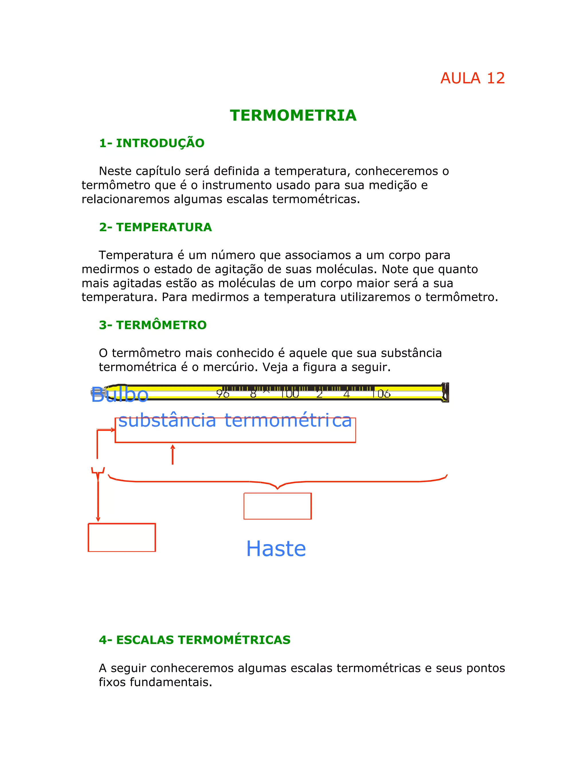 O documento discute termometria, definindo temperatura e introduzindo os principais tipos de termômetros e escalas termométricas. Apresenta as escalas Celsius, Fahrenheit, Kelvin e Réaumur, definindo seus pontos fixos fundamentais de gelo e ebulição da água. Fornece uma equação para conversão entre escalas.