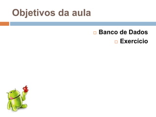 O documento discute o uso de bancos de dados SQLite no Android. Ele explica que cada aplicativo pode criar seu próprio banco de dados usando a API SQLite, armazenado localmente no dispositivo. Ele também descreve como criar e estender a classe SQLiteOpenHelper para implementar os métodos onCreate() e onUpgrade(), e como usar comandos SQL como insert, update, delete e query para manipular dados no banco.