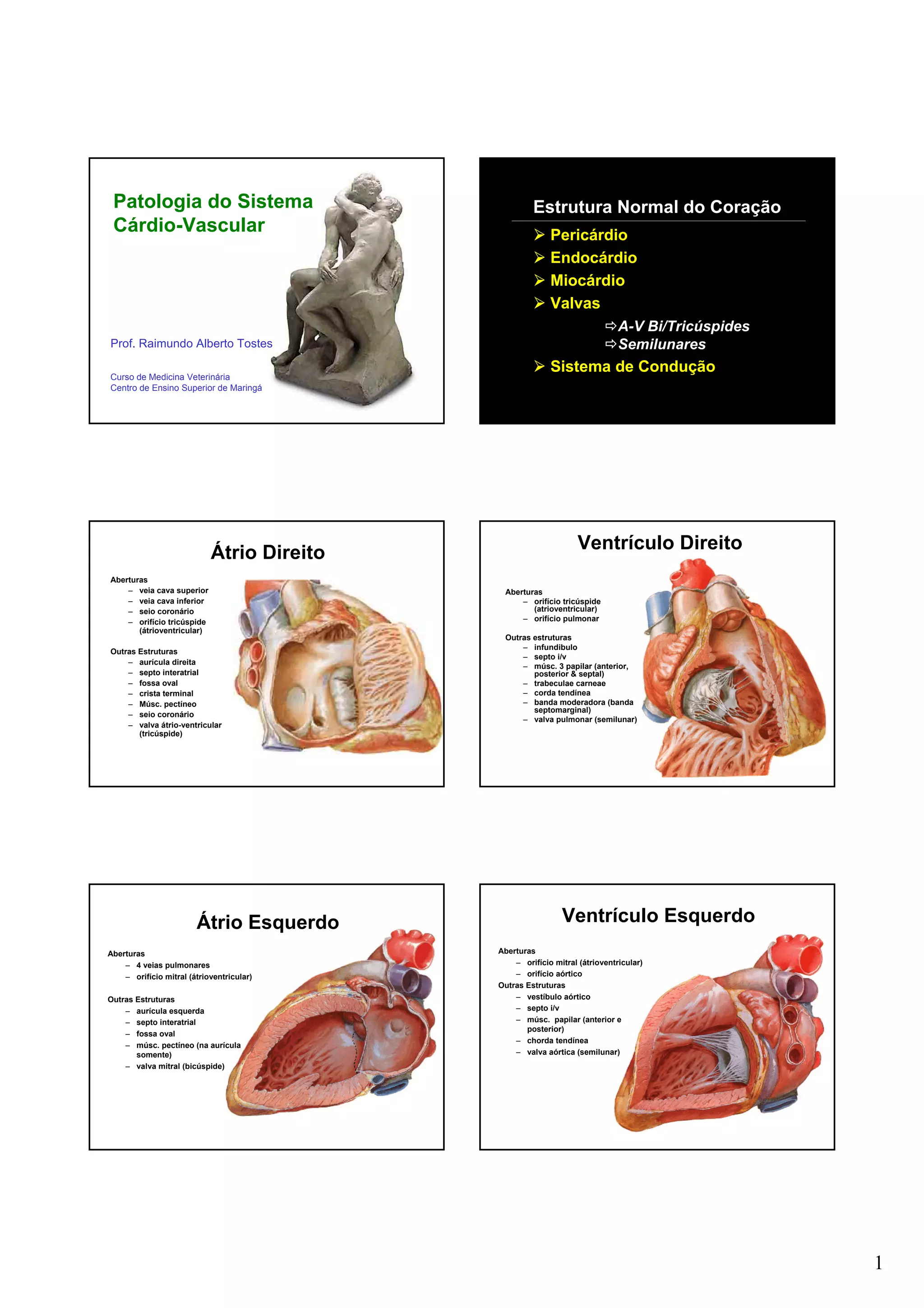 1. O documento descreve a estrutura normal do coração e sistema cardiovascular de animais, incluindo detalhes sobre átrios, ventrículos, válvulas e fluxo sanguíneo.