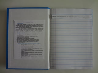 O documento discute o uso do caderno de temas para autoconhecimento. Ele explica que o caderno de temas serve para estimular reflexões sobre o próprio comportamento através de temas propostos e escrita sobre experiências, permitindo uma "reação do espelho" que pode promover mudanças positivas.