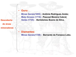 O documento descreve a história da mineração no Brasil, começando com a descoberta de ouro em Minas Gerais em 1693 e diamantes em 1729. Detalha a administração e tributação da mineração de ouro e diamantes no século 18, assim como revoltas populares como a Inconfidência Mineira de 1789. Também discute os efeitos socioeconômicos da corrida do ouro, como a imigração, interiorização da colônia e desenvolvimento urbano e comercial.