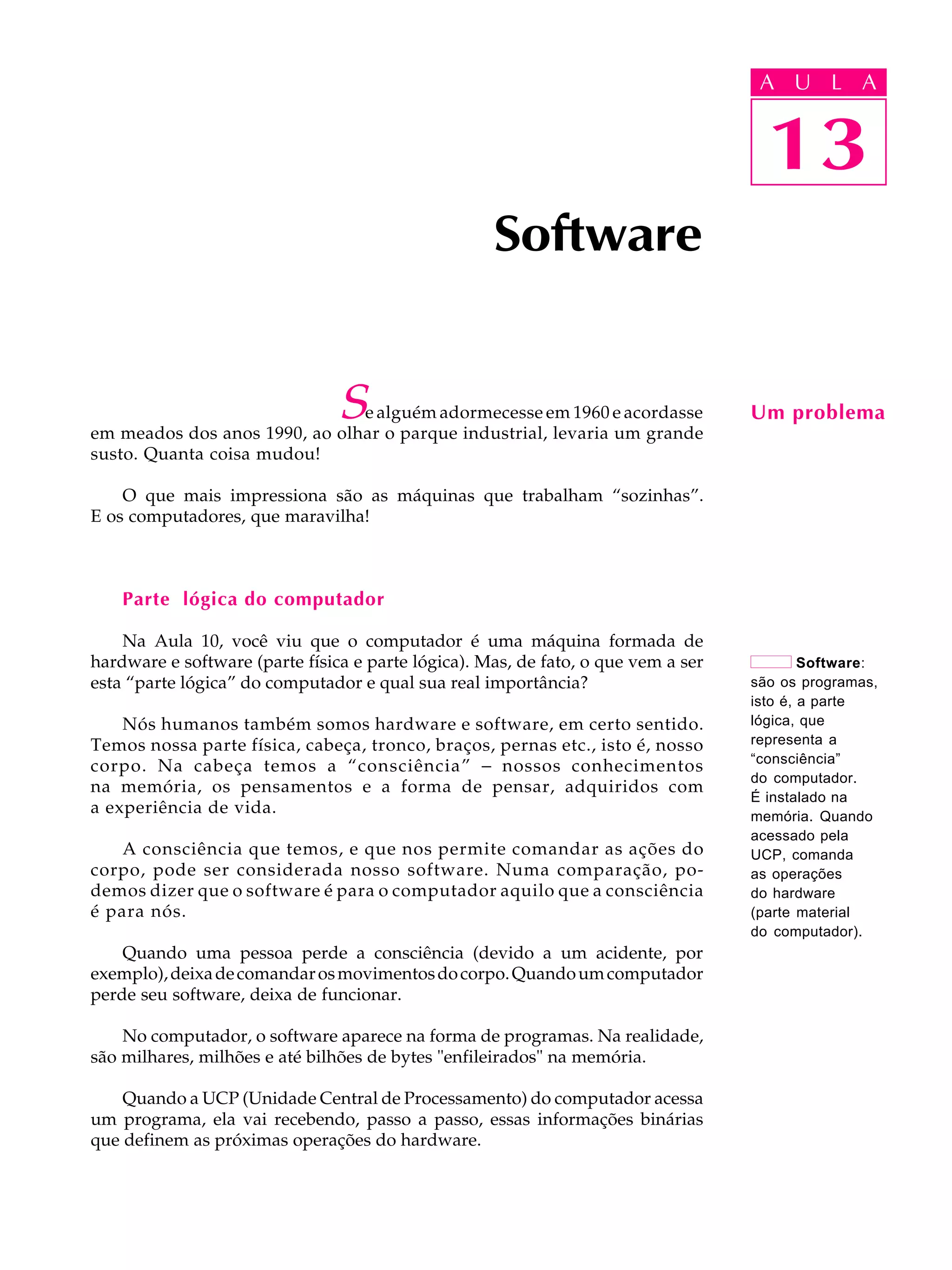 O documento discute a importância do software no computador, dividindo-o em três categorias: sistemas básicos, sistemas operacionais e aplicativos. O software representa a "consciência" do computador e permite que ele execute operações. Os aplicativos tornam o computador versátil ao permitirem que usuários criem documentos, joguem e projetem em diversas áreas.