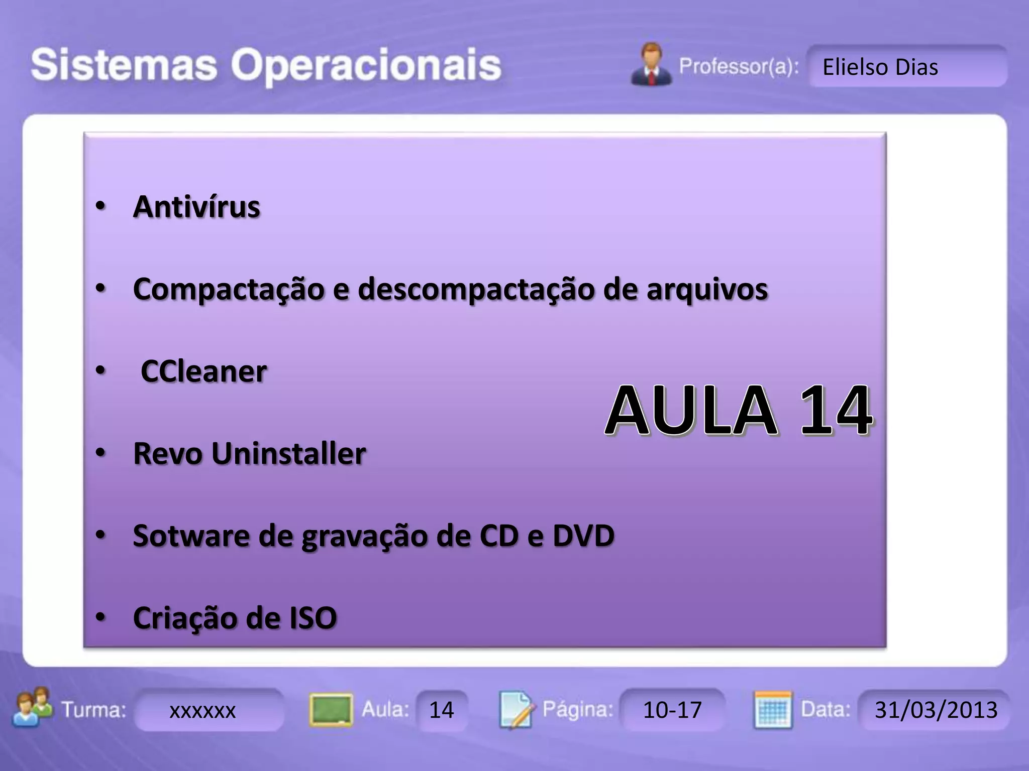 O documento discute vários softwares utilitários, incluindo antivírus, compactação de arquivos, CCleaner para limpeza do sistema, Revo Uninstaller para remoção de programas, gravadores de CD/DVD como Nero e Alcohol, e criação de arquivos ISO. O instrutor Ricardo Paladini apresenta o conteúdo para a turma 2503-B.