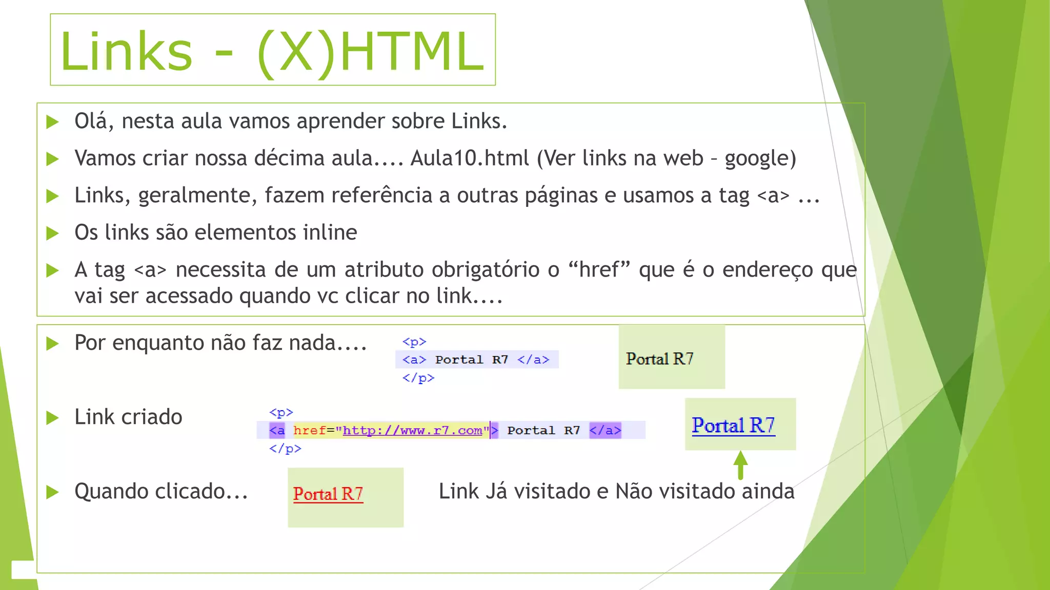 Este documento apresenta os principais conceitos sobre links em HTML. Ele explica como criar links usando a tag <a> e os atributos obrigatórios "href" e opcional "target". Também discute como abrir links em novas janelas e adicionar links a imagens e texto.