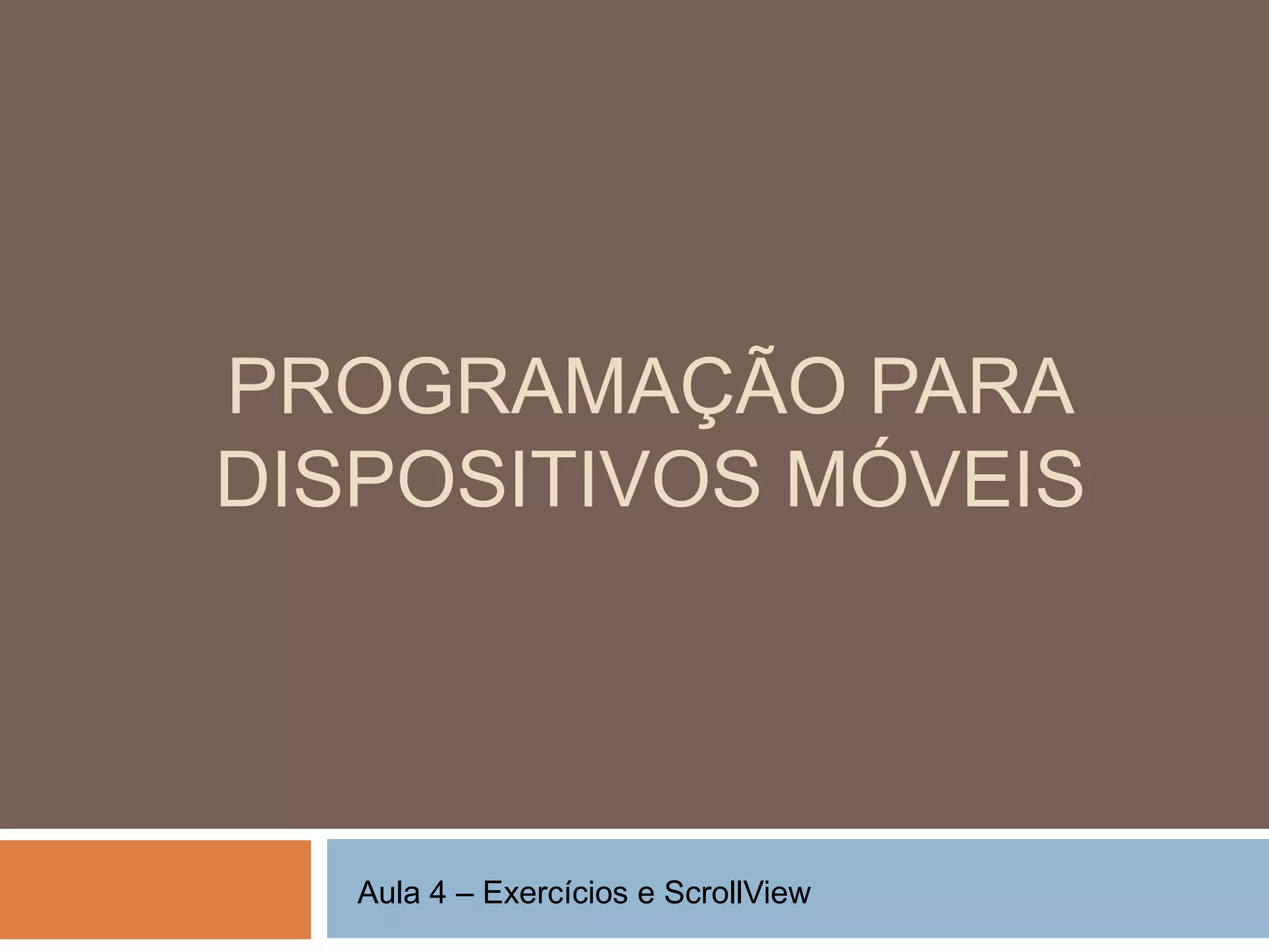 O documento descreve uma aula de programação para dispositivos móveis que tem como objetivos: (1) finalizar um exercício sobre gerenciadores de layout, (2) criar um aplicativo chamado "Tô Rico" para cronometrar tempo extra e centavos ganhos, e (3) apresentar o componente ScrollView.