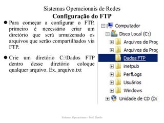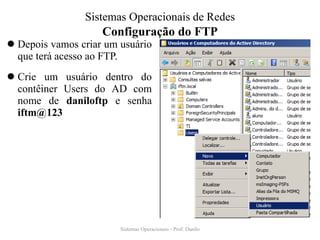 O documento descreve os passos para configurar um servidor FTP: 1) criar um diretório para armazenar arquivos e colocar um arquivo de exemplo; 2) criar um usuário FTP no Active Directory; 3) adicionar um site FTP no IIS apontando para o diretório; 4) testar o acesso FTP localmente ou via navegador digitando o domínio.