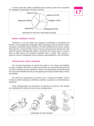 O documento descreve os principais aspectos dos robôs industriais, incluindo: (1) sua estrutura mecânica e configurações básicas como cartesianos e articulados; (2) seus componentes como servomotores e graus de liberdade; (3) aplicações comuns como soldagem e manipulação de peças; (4) métodos de programação off-line e on-line.