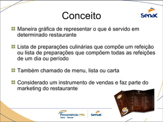 O documento discute as principais características dos cardápios de restaurantes, incluindo conceitos, tipos, estrutura, elaboração e orientações para planejamento. Explica que os cardápios servem como ferramenta de vendas e gerenciamento para o restaurante e discute os passos para elaboração de um cardápio balanceado.