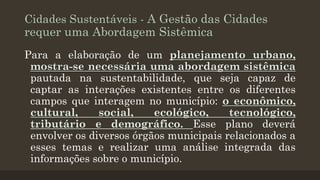 O documento discute caminhos para um planejamento urbano sustentável, requerendo uma abordagem sistêmica que considere os aspectos econômicos, sociais, ecológicos e outros. Ele também apresenta vários eixos temáticos e ferramentas para planejamento de cidades sustentáveis, como indicadores e casos de sucesso, visando promover o desenvolvimento econômico, social e ambiental das cidades brasileiras.