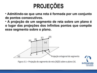 A aula aborda projeções de segmentos de reta em diferentes orientações em relação aos planos de projeção, destacando características de retas paralelas, perpendiculares e oblíquas. Além disso, define várias categorias de retas, como reta fronto-horizontal, reta de topo, reta vertical, entre outras, e discute a pertinência de pontos em relação às retas. Exercícios práticos permitem a aplicação dos conceitos estudados, incluindo representações em épura e verificação da pertença de pontos a retas.