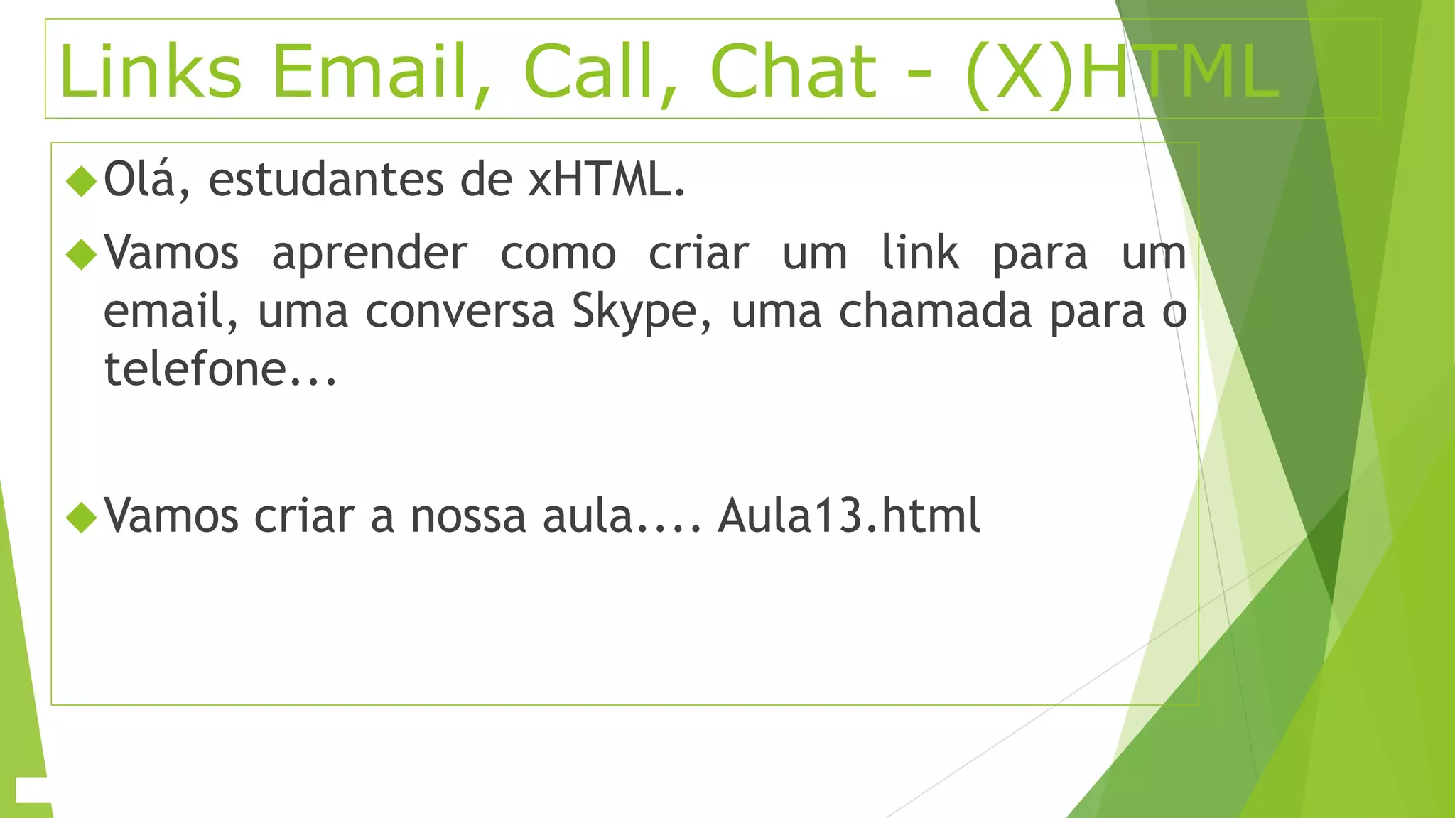 A aula ensina como criar links em HTML para enviar emails, realizar chamadas de telefone e bate-papo online. Os alunos aprenderão a usar o protocolo "mailto:" para criar links de email e poderão adicionar assunto e destinatários. Também aprenderão a criar links para realizar chamadas diretamente de um número de telefone ou bate-papo por Skype.