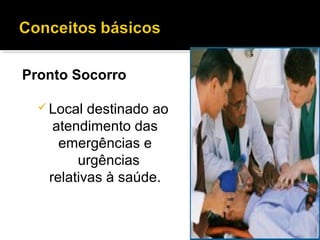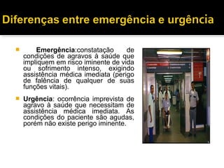 O documento descreve as características e funcionamento de um pronto-socorro, incluindo a definição de emergência e urgência, a triagem de pacientes, as áreas e equipamentos necessários, os procedimentos realizados e fluxos de atendimento.