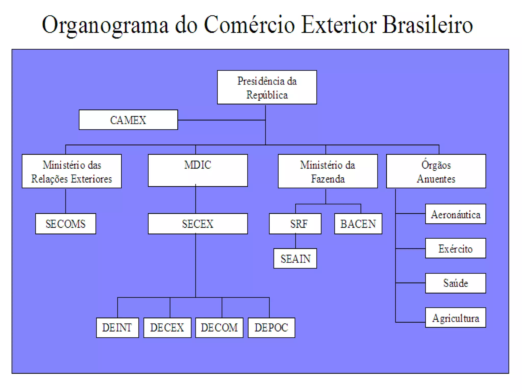 O documento descreve a estrutura do comércio exterior brasileiro, incluindo a CAMEX, órgãos intervenientes como o Banco Central, Receita Federal e Ministério da Indústria, Comércio e Turismo, e os requisitos para habilitação como importador ou exportador no sistema SISCOMEX.