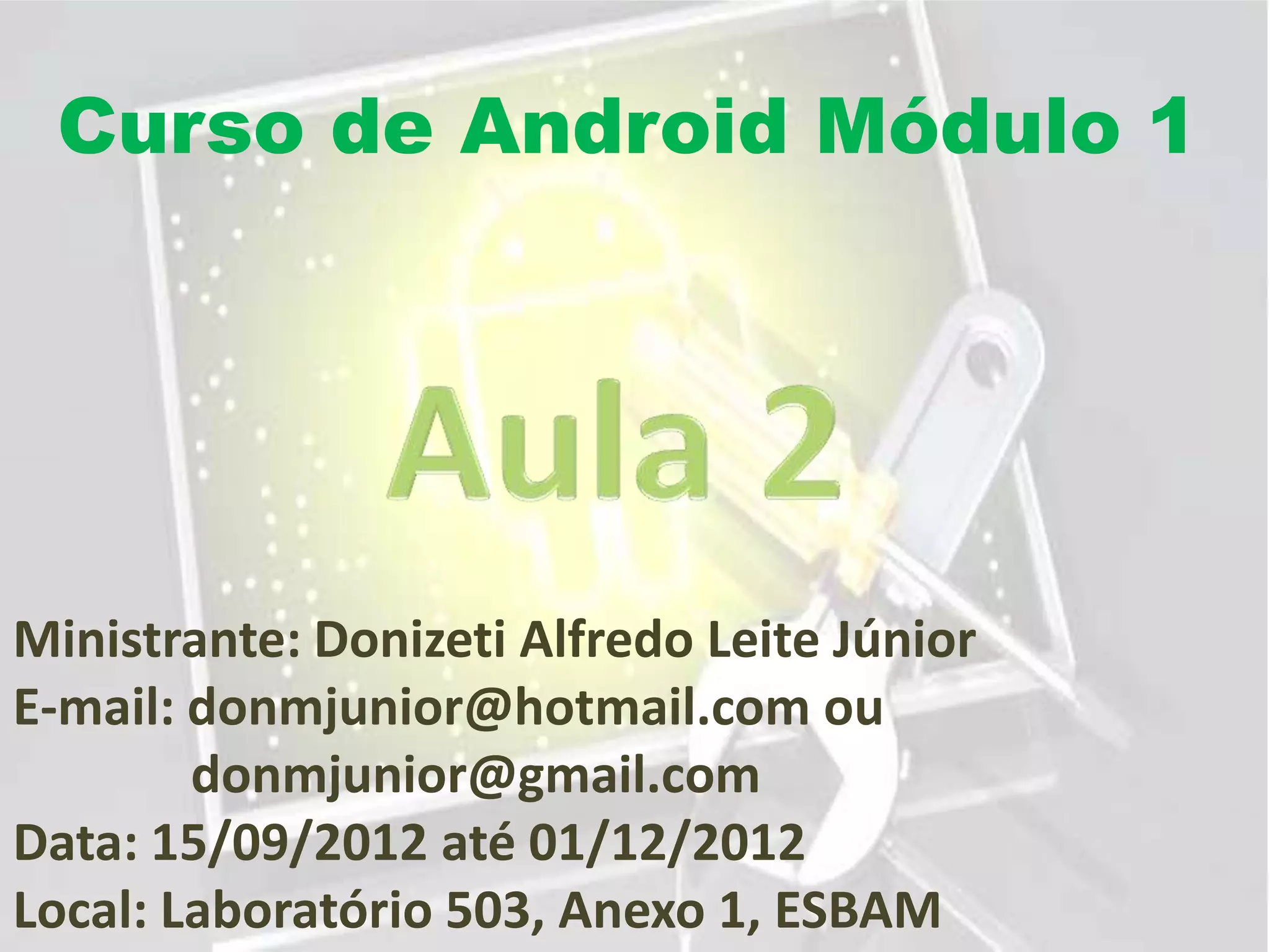 Este documento descreve um curso de Android dividido em módulos. O primeiro módulo apresenta a plataforma Android, o IDE Eclipse, o SDK e o emulador Android. Ensina a criar e executar projetos no Eclipse com múltiplas activities. Instrui a editar layouts e recursos visuais usando arquivos XML e a executar aplicativos no emulador.