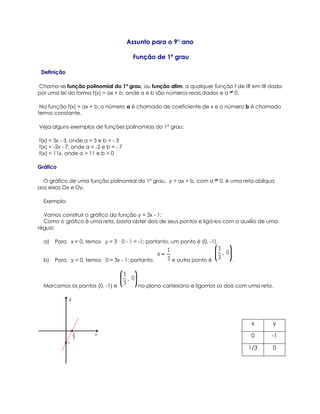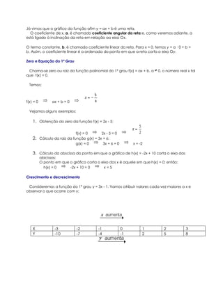 O documento discute funções do primeiro grau, definindo-as como f(x)=ax+b e fornecendo exemplos. Explica que o gráfico de uma função do primeiro grau é uma reta, e descreve como calcular o zero e estudar o crescimento/decrescimento e sinal de uma função do primeiro grau. Por fim, discute como resolver inequações do primeiro grau.