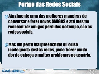 O documento discute os perigos das redes sociais e fornece recomendações para uso seguro. Ele alerta que compartilhar informações pessoais ou planos pode trazer problemas, e que contas sincronizadas podem publicar conteúdo em redes inapropriadas. O documento também menciona que fotos de família públicas podem ser acessadas por qualquer um, e que links em redes sociais podem esconder vírus.