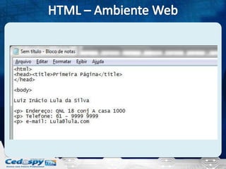 Este documento fornece uma introdução básica aos principais elementos da linguagem HTML, incluindo tags, extensões de arquivos .html, editores de texto, e tags comuns como <p>, <br>, <b>, <i> e <u>. Os alunos são então designados a criar um currículo HTML usando esses elementos como uma atividade.